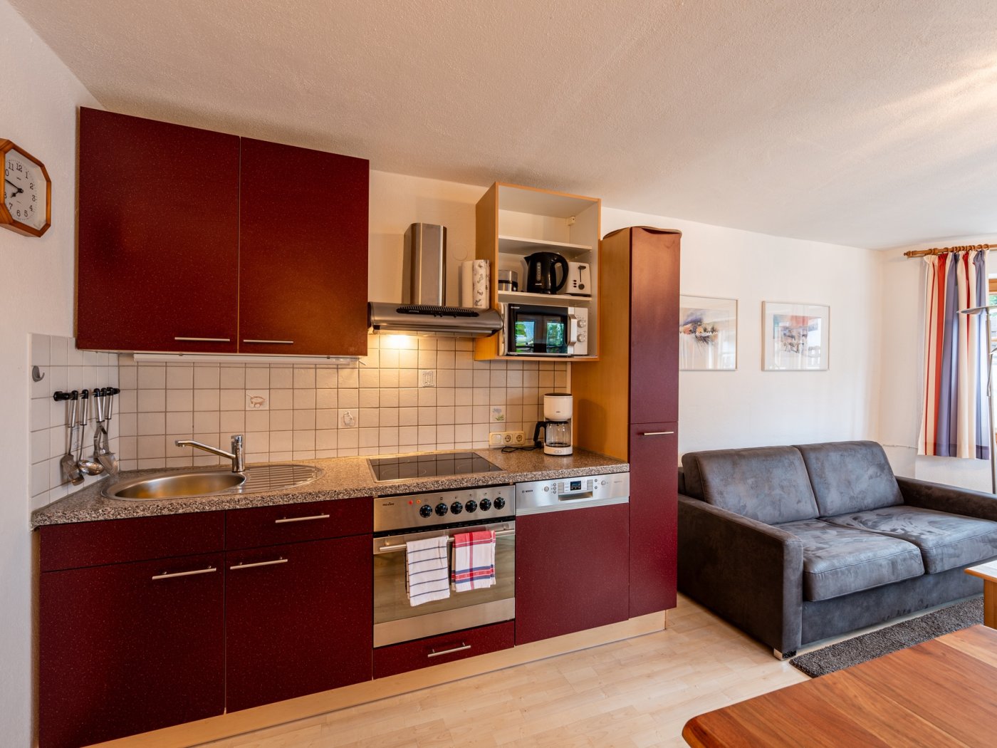 Der Küchenblock ist sehr gut ausgestattet mit Kühlschrank, 4-Platten-Herd, Spülmaschine, Kaffeemaschine und Mikrowelle.